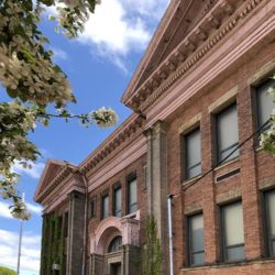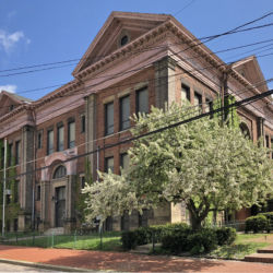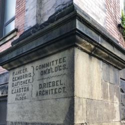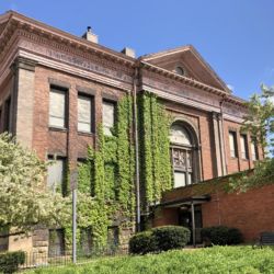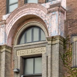 This stately masonry school building, evoking a Richardsonian Romanesque style, features symmetry, intricate dental detailing and perimeter brackets, and a stone arch. Beck Street School was designed by David Riebel, the first architect of Columbus Schools, and has stood in historic Schumacher Place near German Village for 135 years. Riebel designed nearly 40 Columbus public schools between 1891 and 1921, and they are some of our most notable landmarks. The building rests on a massive stone foundation and reflects the civic value accorded to education at the time.